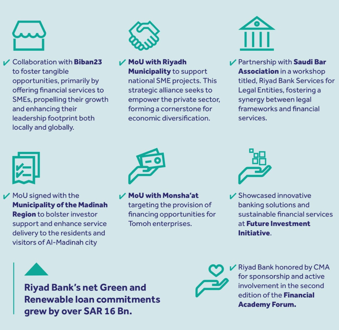 In February 2025, Riyad Bank joined the United Nations Global Compact, becoming one of the first Saudi banks to participate, reflecting its commitment to sustainability and social responsibility. Additionally, in 2024, it launched a comprehensive strategy to support sustainable projects.