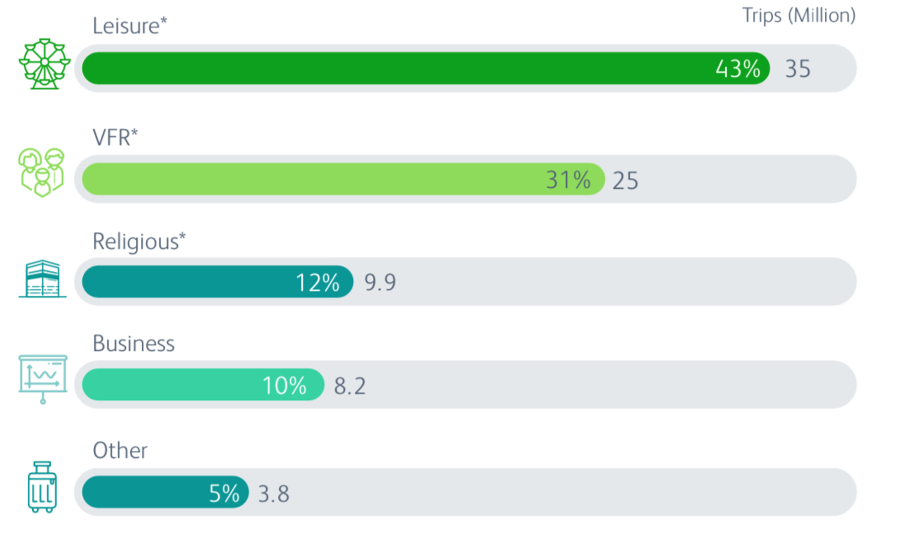 Leisure tourism topped the list of purposes for local tourist trips, with 35 million tourists, representing 43% of all domestic tourism trips.